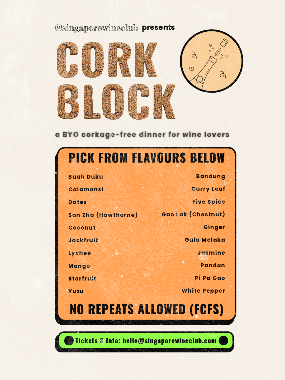 Drop us an email at hello@singaporewineclub.com if you’re keen on joining and after confirming your spot, we’ll add you to the dinner chat group to “chope” your chosen flavour.
